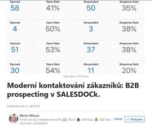 Největší úspěch, co se mi dosud na LinkedIn podařil, je můj článek s názvem Moderní kontaktování zákazníků: B2B prospecting v SALESDOCk. Popisuje přímo jeden projekt u klienta, kdy jsme prodávali jeho software. Popisuje detailně proces prodeje, jaké metriky sledujeme, jak interagujeme s klienty, jaké používáme nástroje pro automatizaci. Díky tomu článku se podařilo uzavřít 2 zajímavé obchodní příležitosti a přímo ti klienti zmiňovali, že na základě článku si mě našli. Navíc článek funguje pořád, stejně jako celý LinkedIn. Když na něj člověk klikne, vidí ho bez reklam, působí přímo na klienta.