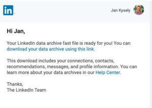 Jako nejpřínosnější „datový pack“, který z LinkedIn můžete dostat, je seznam spojení. Tvrdě vybojovaná spojení doporučuju zálohovat pravidelně.