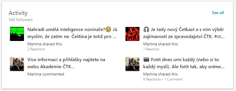 Většinou se na LinkedIn připojuji každý den, aspoň na chvíli. Pokud nedávám vlastní post, tak jenom proto, abych projela nové příspěvky nebo pročetla komentáře a vzkazy. Sama dávám příspěvky na osobní a firemní stránky dvakrát, třikrát do týdne. Máme několik pravidelných rubrik na firemním profilu – každý pátek informujeme o novém Četkastu (zpravodajském podcastu ČTK), dvakrát do měsíce zveřejňujeme rozhovory se zaměstnanci ČTK. Nepravidelně propagujeme firemní novinky, nejen z mediální sféry, ale i ty nemediální – z Akademie ČTK, Protextu, Fotobanky. Většinou je to formou příspěvků s fotkou nebo odkazem na náš web, zkoušeli jsme i videa, infografiku nebo krátké prezentace.