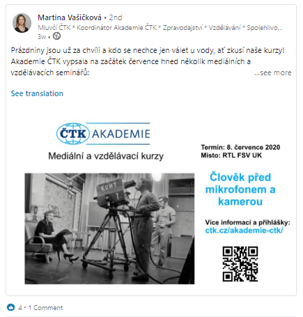 Já osobně jsem v ČTK nastoupila na úplně novou pozici, po šesti letech v zahraničí a po 18 letech ve zpravodajství jsem přešla na pozici mluvčí. Potřebovala jsem udělat pořádek ve firemních sociálních sítích a vlastně i v těch osobních. Firemní LinkedIn byl do té doby skoro nevyužívanou sítí. Současně jsem jako koordinátorka práce Akademie ČTK hledala další platformy pro zviditelňování vzdělávacích a mediálních kurzů Akademie ČTK; síť LinkedIn mi pro to přišla ideální.
