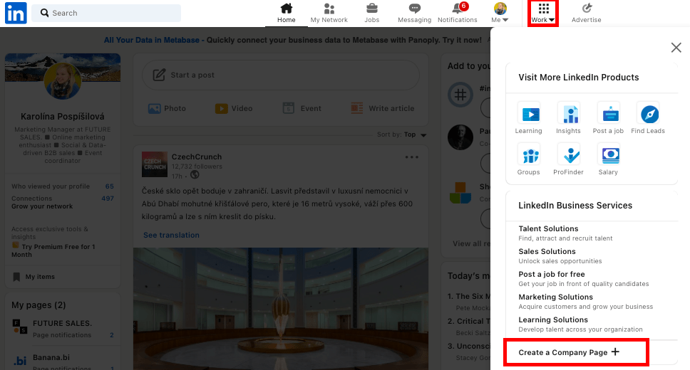 Obr. 1: Jak si založit firemní stránku na LinkedIn.