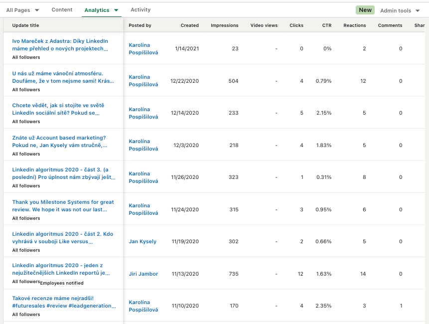Zajímavé informace o návštěvnících stránek a efektivitě jednotlivých příspěvků najdete v části Analytics (Statistiky).