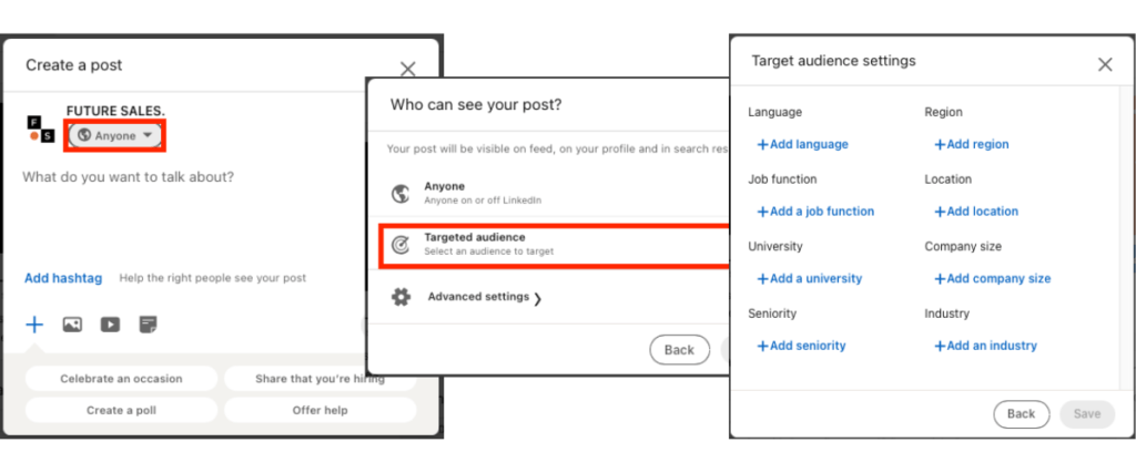 Obr. 7: Nastavení segmentu cílové skupiny pro sdílení obsahu na firemní stránce.